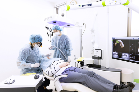 手術中、骨の状態やドリルの位置が、画面上にリアルタイムで3D表示されます。目視でも確認しながら手術を進められますから、事前にシミュレーションした通りの位置に、誤差なくインプラントを埋め込めます。